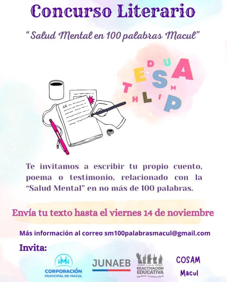 La Corporación Municipal de Desarrollo Social de Macul, junto al Centro Comunitario de Salud Mental (COSAM), invita a la comunidad a participar en el concurso literario “Salud Mental en 100 Palabras”, una iniciativa que busca promover la reflexión, el diálogo y la sensibilización sobre la salud mental a través de la creatividad y la escritura breve. La convocatoria estará abierta hasta el 14 de noviembre de 2025.